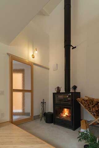 扇型の敷地に立つ六角形の住まい。変形地を巧みに生かし、住宅街側はプライバシーを確保しつつ、敷地の東側に広がる森側には窓をたくさん設けて大きく開くプランとなっています。室内に現れる複数の不規則な形や斜めのラインは変化に富んだ空間を生み出し、同時に天井高や建具の寸法などの工夫ですっきりとした印象に。家のどこにいても周囲の自然を感じられるように、空間ごとに切り取り方が計画された窓、三角形の吹き抜け、リビングとフラットにつながるウッドデッキなど、外部を取り込む工夫が凝らされています。家族が長く心地よく過ごせるよう、国産木材や漆喰など、自然素材を多用。調理にも使用できる薪ストーブを導入し、高性能な住宅をやわらかな温もりが満たしています。
