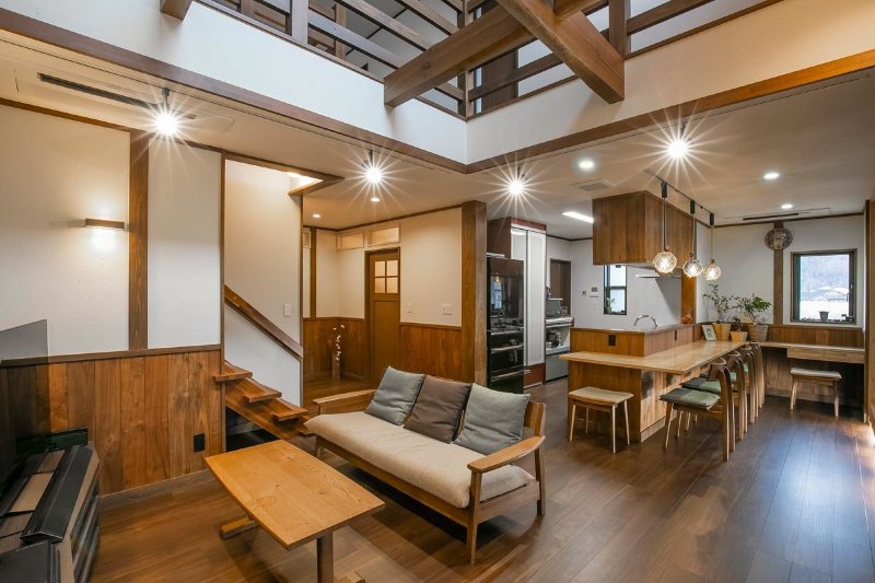 家族が憩える空間づくりにこだわったTさん宅。和の趣を感じる古民家風の住まいは、大きな吹き抜けが上下階をつなぎ、どこにいても家族の気配が感じられあたたかい住まい。素材も厳選し、珪藻土や木を使用。職人の技が光る造作の建具や家具もふんだんに取り入れている。