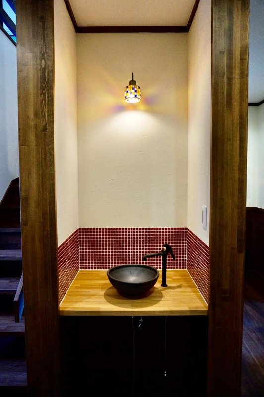リビング階段の脇に設けた手洗い。照明やタイル、遊びゴコロが感じられる水栓など、一つ一つががかわいらしく手洗いが楽しくなりそう。