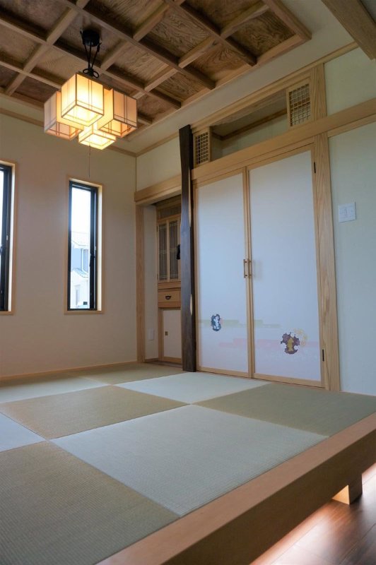 格天井の小上がり和室は、職人の技と知恵を駆使。仏壇・神棚・収納を造作し、床柱はえんじゅを採用。段差には間接照明を取り入れ、ご主人が晩酌や音楽などを愉しむ空間に。