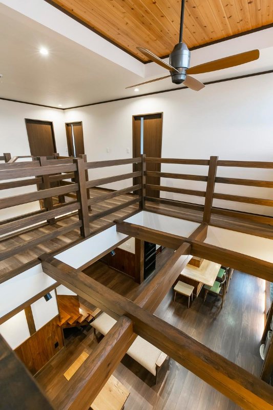 古木風の梁が架かる開放的な吹き抜けが1階と2階をつなぐ。回廊のような2階ホールもユニーク。