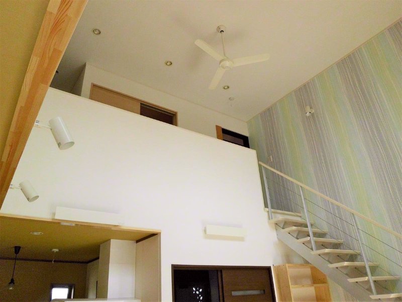 吹き抜けとスリット階段の効果で、明るくて開放的な大空間。