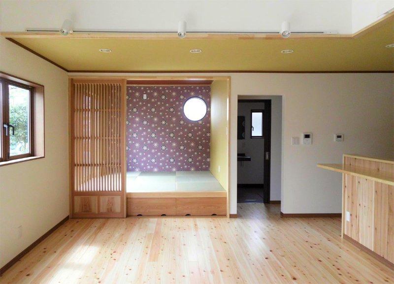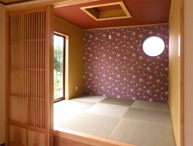 モダンな印象の和室。丸窓と個性的なクロスの組み合わせでオリジナルな空間に。