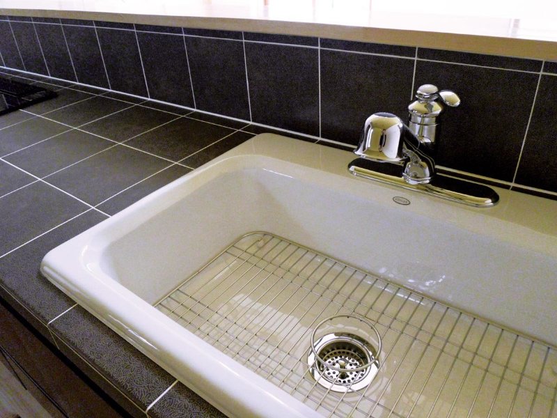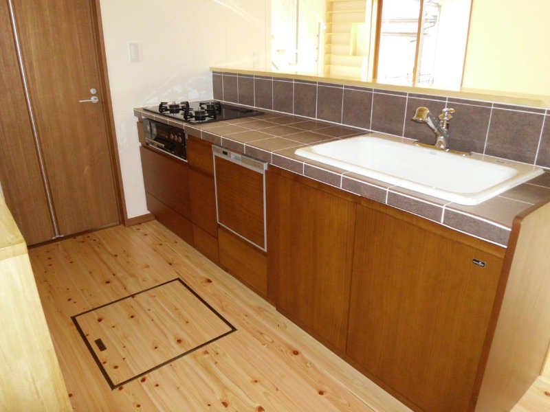 面材は無垢材、ワークトップはタイル、シンクはホーローと素材にこだわったおしゃれなキッチン。
