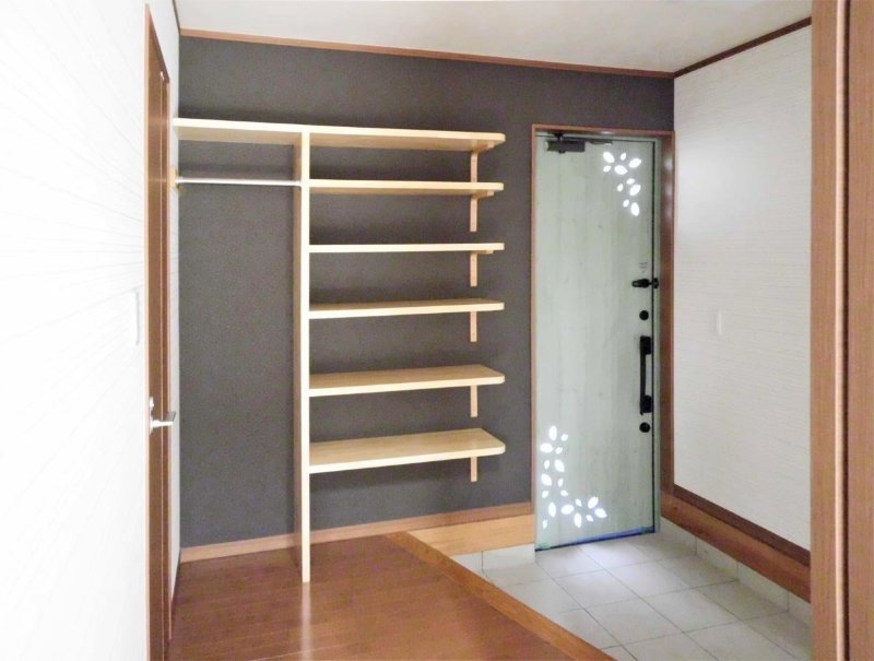 玄関の収納は見せる収納スタイル。上着をかけられるスペースも。玄関からすぐにキッチンへ行ける家事ラクな動線を採用した。