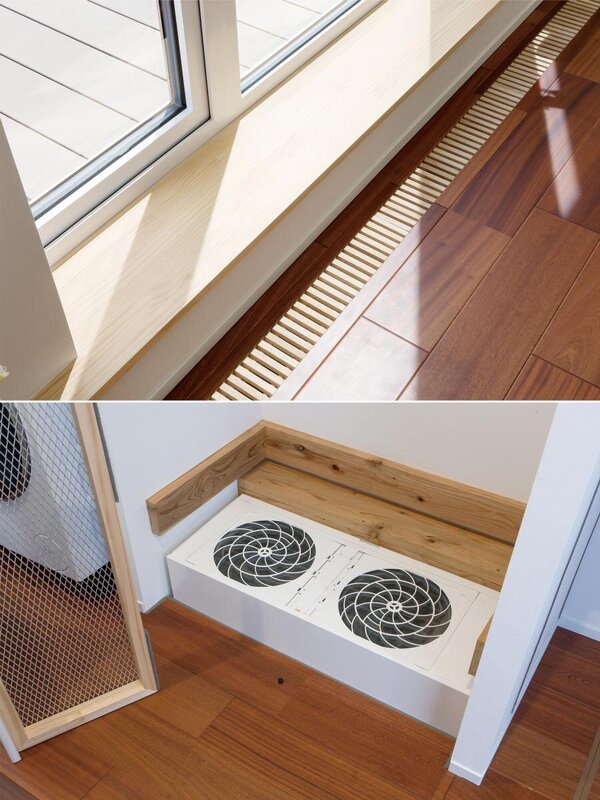高断熱・高気密な性能を生かし、冬は床下エアコン1台、夏はリビングのエアコン1台で家全体を冷暖房できます。吹き抜けや階段、ガラリを通して暖気・冷気が効率よく循環し、一年を通した快適な室温をキープ。少ないエネルギーで効率よく空調できるため、省エネと心地よさを両立します。(※床下エアコン採用時は、基礎構造の確認が必要です)