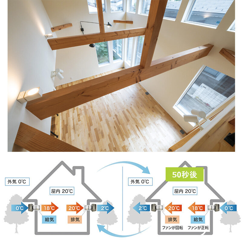 内断熱と外断熱によるダブル断熱工法や、トリプルガラス樹脂サッシの採用により、断熱性を徹底追求。断熱等性能等級7を実現しています。また全棟2回の気密測定を課して確認するC値は0.2以下。第一種熱交換換気システムの採用の相乗効果で、エネルギー効率に優れ健康的な家を実現しています。