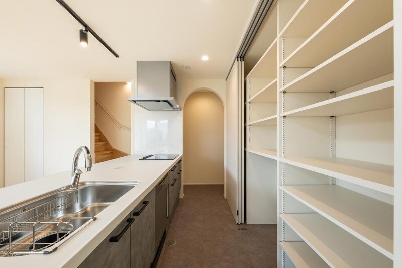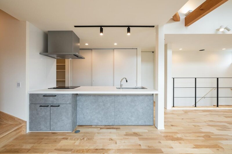 家事の指令塔となるワークトップ。シンクとIHを最短動線で結ぶ設計。背面は引戸収納でフラットに、作業効率を高めます。