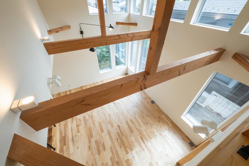 化粧梁をはじめとする構造美と、開口により照明が不要なほど明るい機能性が共存する吹き抜けの大空間。日射や動線を最適化し、軽やかな暮らしを実現する。