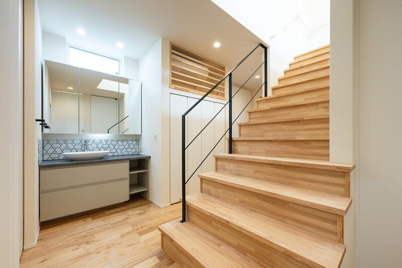 玄関から洗面化粧台のあるホールを経由し、2階リビングに行く動線。帰宅後の手洗いが習慣になることを想定した間取り。
