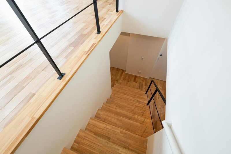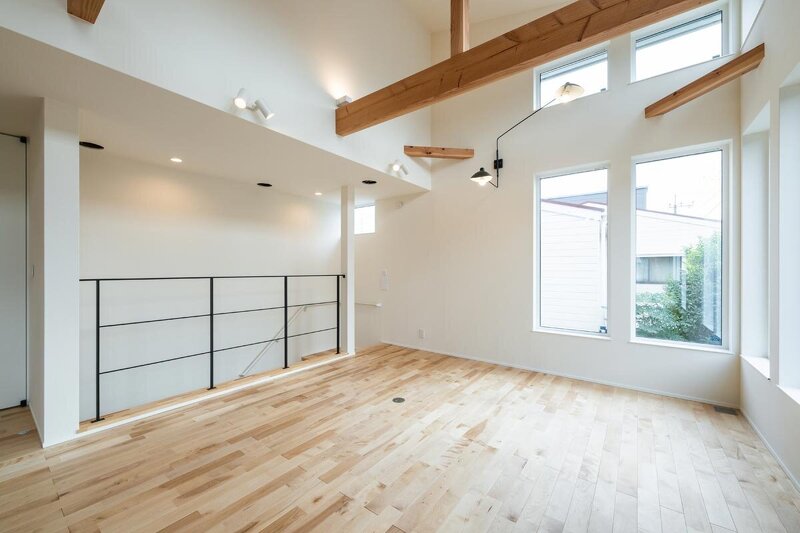 自然光と構造がつくる、やさしい抜け感やハイサイド窓が奥行きを演出。無垢床とアイアンの対比を漆喰壁がやさしく包み込む。
