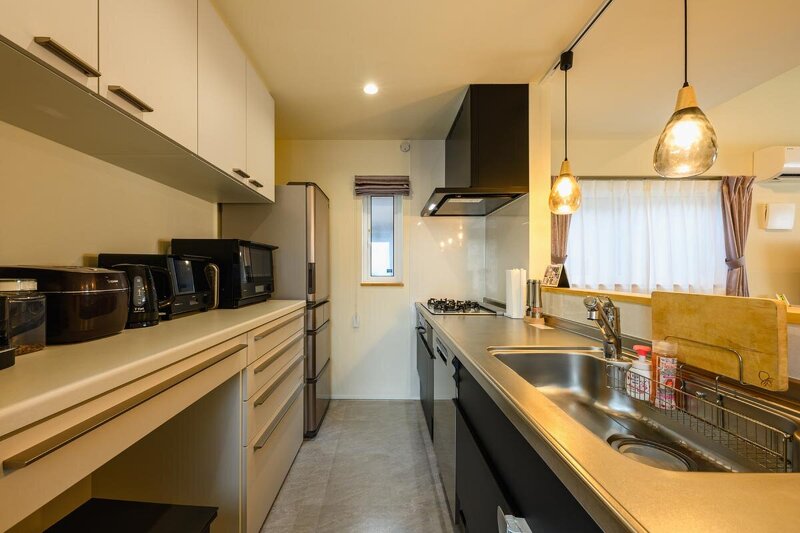 機能性と暮らしやすさを兼ね備えたキッチン。I型キッチンは動線が短く、収納もたっぷり。ペンダントライトがダイニングとの一体感を演出している。