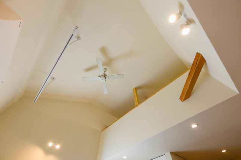吹き抜けのシーリングファンが空気を循環。全棟標準の高断熱・高気密性能により、上下の温度差が少なく一年中快適に暮らせる。