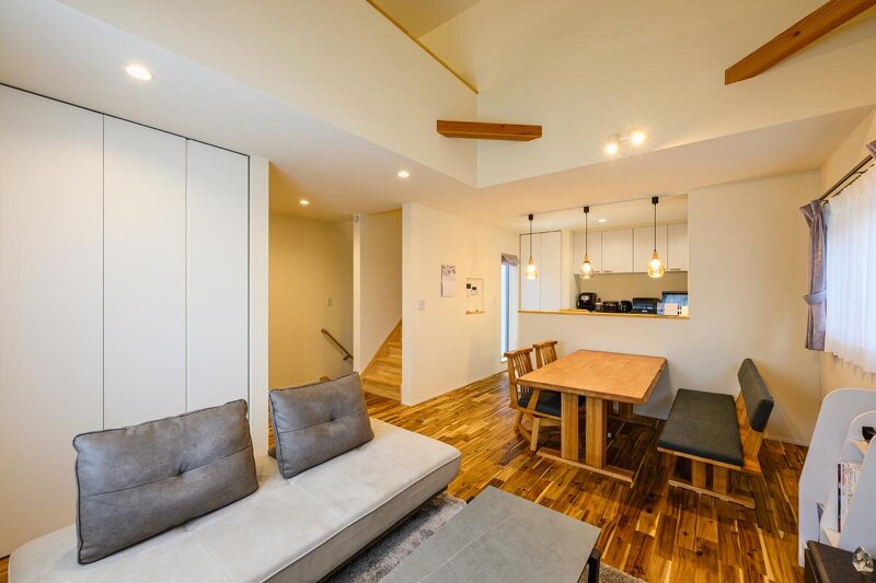 弊社の特徴の性能の高さと、ご夫妻の趣味を叶える間取りを実現したお家です。ウィンタースポーツ用品を余すことなく収納スペースと、友人を呼んでもゆとりを持って楽しめる吹き抜けがあるリビングが特徴的です。周囲を気にせず大切な人たちとの時間を楽しめる空間に満足していただくことができました。