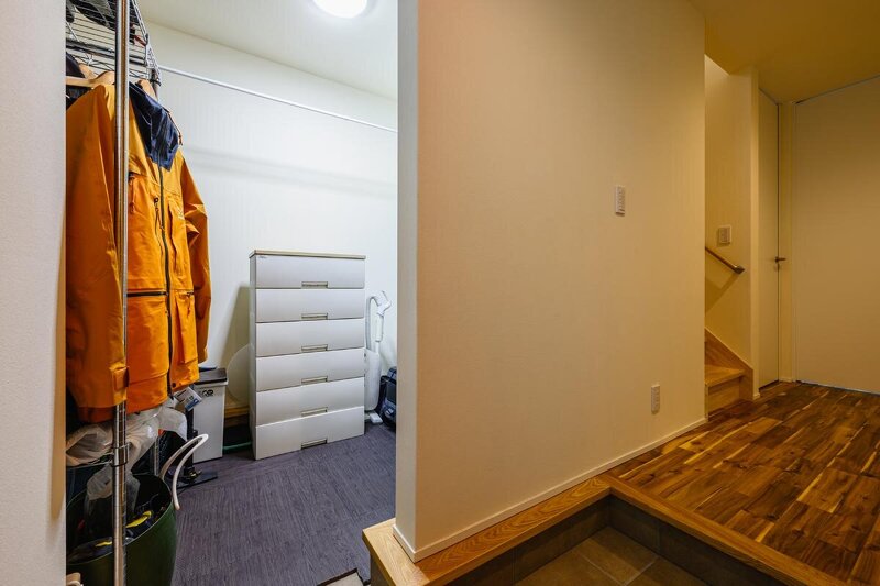 戸建てだから叶う、自由で機能的な空間。広々とした玄関横には大きなシューズイン収納。趣味の荷物も日常の靴もすべて収まるため、暮らしの動線がスムーズに。