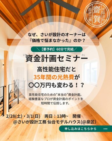 イベント「高性能住宅だと35年間の光熱費が●●万円も変わる!?」資金計画セミナー in 仙台