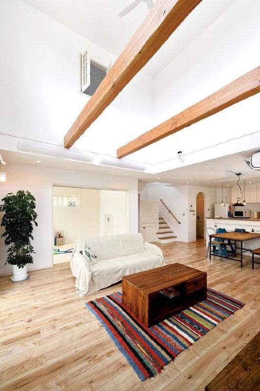 間仕切りのないワンフロア設計で、心地良い開放感を味わえるリビング。頭上をダイナミックに駆ける梁が空間にアクセントをプラス。