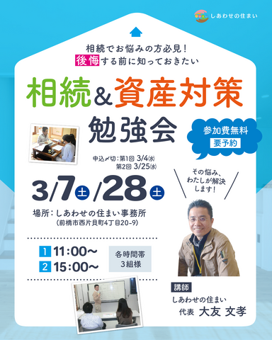 そんなお悩みを、【ご家族がもめないためのポイント】からわかりやすくお伝えする少数セミナーです。相続は「早めの準備」がご家族を守るいちばんの方法。地元工務店だからできる、暮らしに寄り添った相続と資産対策の話をぜひこの機会にお聞きください。