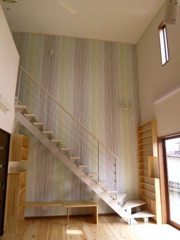 無垢材や塗り壁を贅沢に使用したリビング。吹き抜けの開放感も加わり、居心地の良さが存分に感じられるだろう。