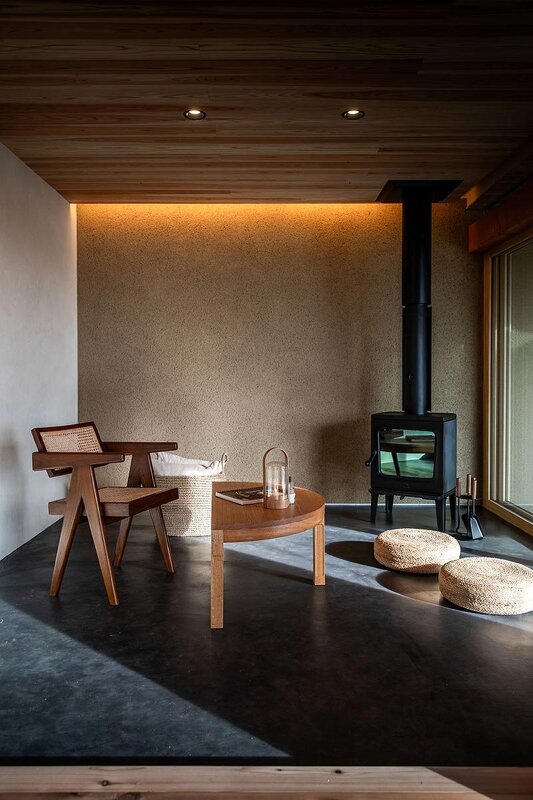 黒モルタルで仕上げられた内部の土間。土間に薪ストーブを置いて、夜の帳の下で火を焚いてみる。原初の「火の間」が住まい手の遺伝子を震わす情景を立ち上げてくれる。