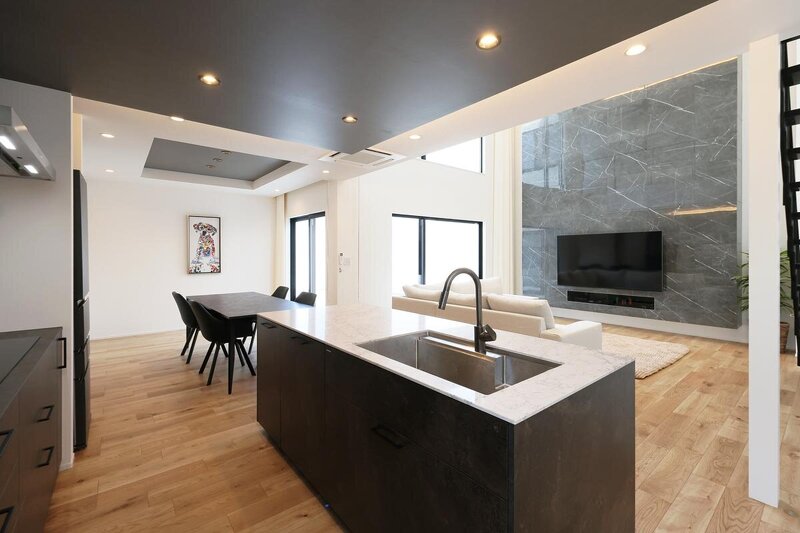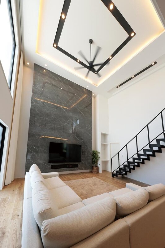 リビングで圧倒的な存在感を示すのは、豪快な吹き抜けと石張り調タイルを天井まで張り巡らせたメインウォール。折り上げ天井にあしらった間接照明も華やかさを演出。