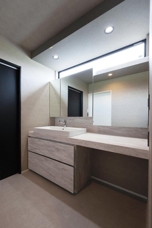 トイレもグレーをメインカラーに、2か所に間接照明を設置した非日常的なデザインに。