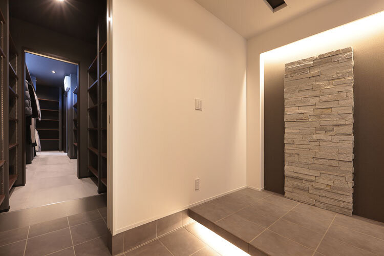 家族や客人を出迎える最初の空間となる玄関ホール。石張り調のタイル壁に間接照明を交えたラグジュアリー感あふれる佇まい。