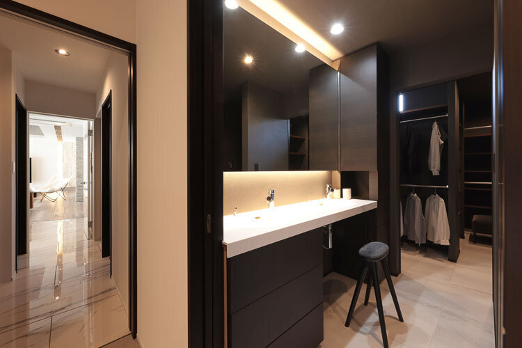 ウォークスルークローゼットに隣接した洗面化粧台。ダブルボウルを備えており、見た目にも住まいのコンセプトである「ホテルライク」感を強調している。