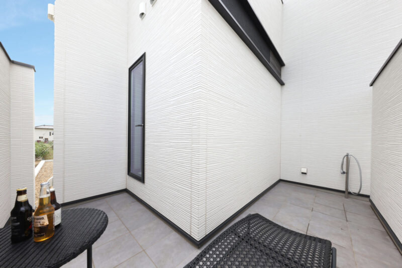 サウナ後に「整う」ために、シャワー付き外水栓を完備したプライベートテラス。夏の夜には家族や友人たちとバーベキューや晩酌を楽しんでいるとか。