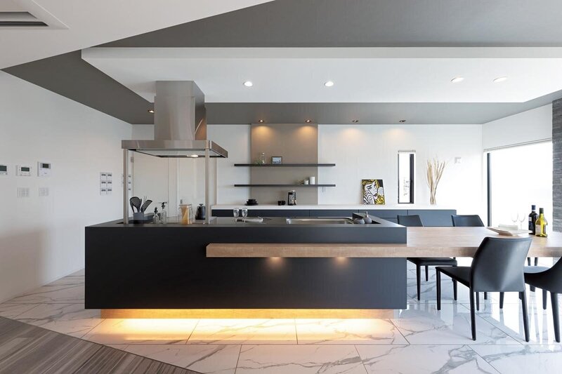 水平ラインが伸びやかな外観は南北に抜けられるオープンガレージに加えて、シンボルツリーが彩りをプラス。ラグジュアリー感あふれる玄関を通り抜けた先に広がるLDKでは、キッチン一体型のダイニングテーブルや飾り棚など「なければ、つくる」というシブサワスタイルの優れた造作力と意匠性を存分に感じられる空間に。さらにサウナも完備。