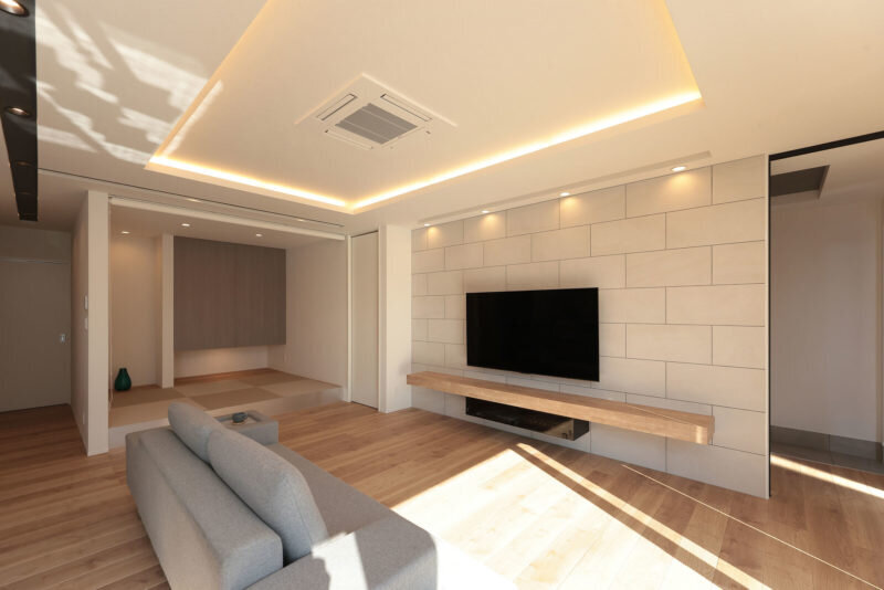 「ブロック塀」をモチーフとしたタイルを用いたリビングのメインウォール。ナチュラルな空間に華やかさをもたらす間接照明の使い方も◎。小上がりの畳コーナも併設。