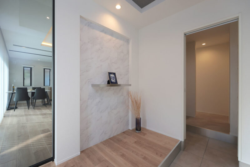 LDKと、洗面脱衣室や浴室の2方向へ繋がる「2WAY動線」。石張り調のタイルを張ったウエルカムウォールも見所の一つ。