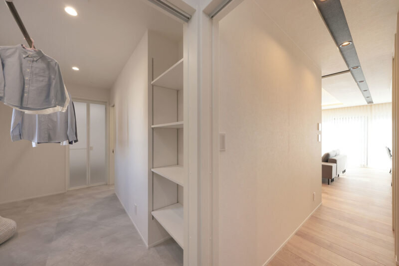 脱衣室を兼ねたランドリールーム。主寝室を除き、カラーコーディネートに統一感がある。
