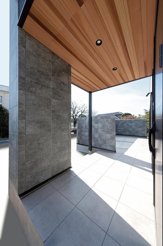 グレー×ブラックというモノトーンなカラーコーディネートに対して、エントランスの軒天に張ったレッドシダーがアクセントに。