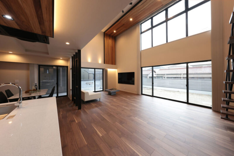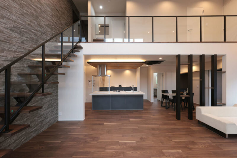 リビングは、吹き抜けのある大空間を採用。壁から天井まで伸び上がったレッドシダーや迫力のある鉄骨階段、間接照明などを大空間リビングにセンス良くまとめ上げている。