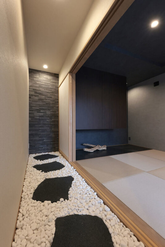 通り土間の石畳や玉砂利が「料亭」や「高級旅館」をイメージさせる和室。シブサワスタイルの手にかかれば、伝統的な和の空間もスタイリッシュに、かつ個性的にデザイン。