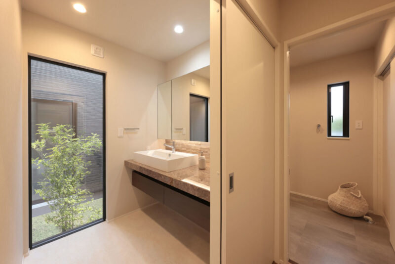 シンボルツリーを植えた中庭にも触れられる、ラグジュアリー感あふれる洗面化粧台。洗面ボウルの右隣の奥様のメイクスペースとなる。