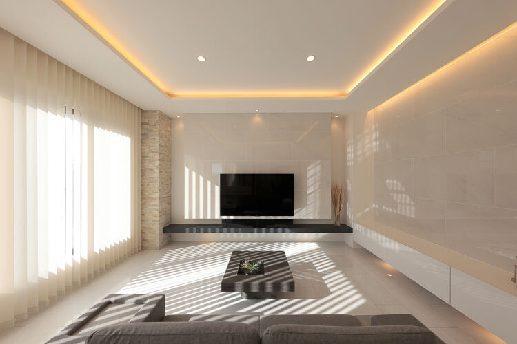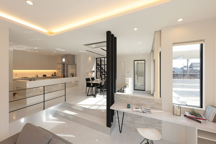 外観の印象そのままにシンプルモダンを軸にホテルライク×ラグジュアリー空間に。リビングは床を二段下げて空間の変化とゾーン分けをもたらし、遊び心と落ち着きも感じる。