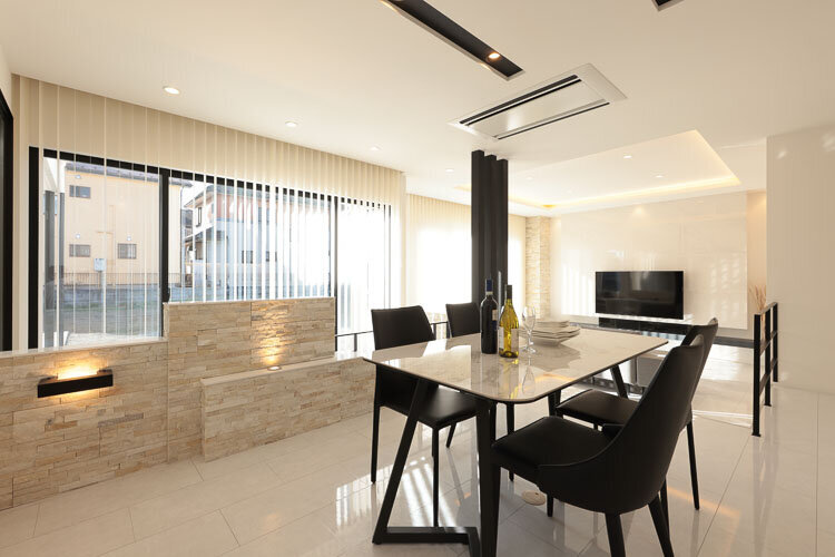 施主のご要望とシブサワスタイルのデザイナーたちのセンスと経験が融合したダイニング。土間を隔てる壁も石張り調のタイルと間接照明で華やかに演出している。