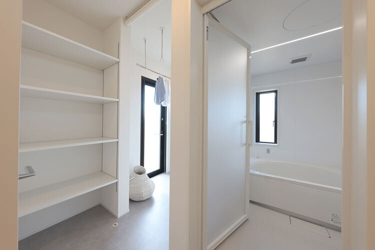 脱衣室に隣接したランドリールームも“家事ラク”を叶えるための空間の一つ。大容量の可動棚を完備。