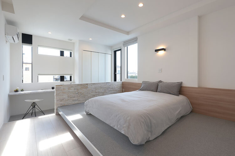 カーペット敷きのベッド&デスクスペースのある主寝室。まるでホテルのようなコンパクト&ラグジュアリーな、美的感覚の豊かな一室に仕上がっている。