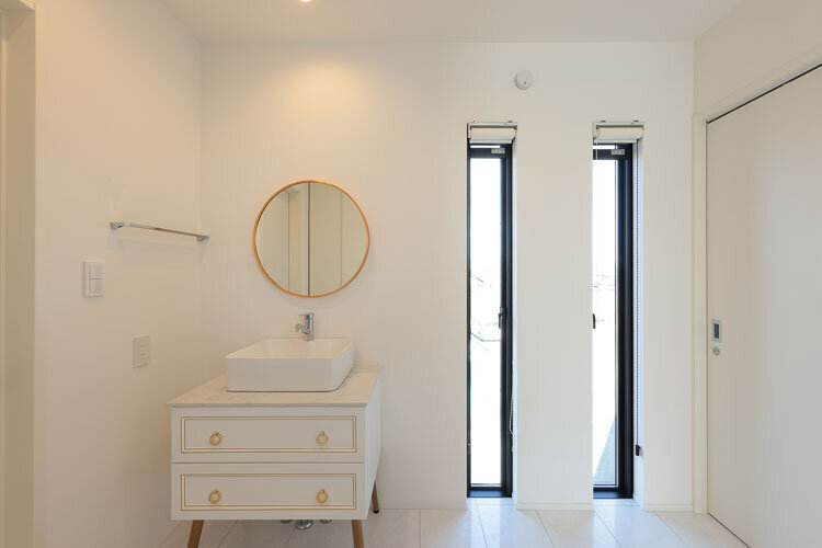 2Fのホールに上がると、そこには奥様の素敵なセンスが光る家具のような手洗い台がお目見え。そこを中心に、左右に主寝室と子ども部屋が設けられている。