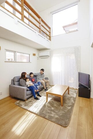 吹き抜けから視線を落とすといかに開放的なLDKかわかる。これだけの大空間だと耐震・断熱性も気になるが、「耐震等級3」「断熱等級5」を確保する性能も見逃せない。