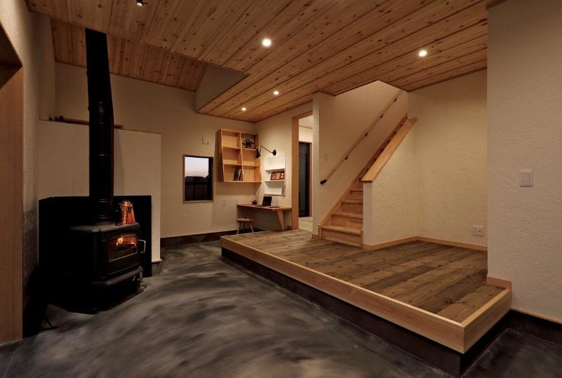 面積の半分を土間に設定したリビングエリア。造作デスクや小屋裏収納へ続く階段など行動がスマートになるよう配慮されている。薪ストーブの手入れがしやすいのも魅力。