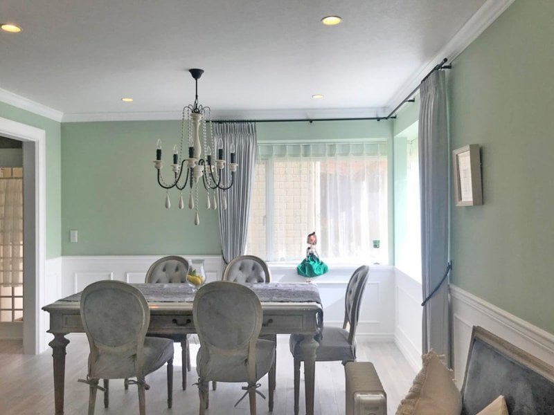 小上がり和室と暗いリビングを明るいLDKにリフォーム。グリーンのペイントは海外から色見本を取り寄せ、何度も打合せをし施主の理想の色に近づけた。腰壁のモールディングとの取り合わせも美しい仕上がりになっている。ティーテックは、現在お住みの住宅を丁寧にリフォームし、より美しい住空間に変身させます。