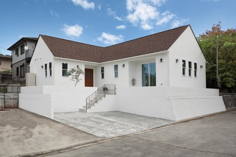 アイアン手摺の外階段を上がって玄関へとアプローチするA氏邸。白い塗り壁とL字の外観がとてもお洒落な平屋になっている。