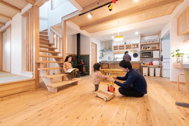 新築、平屋、木製サッシ、土間収納、キッズスペース、造作家具・建具、自然素材をふんだんに使用、2×4、2×6工法