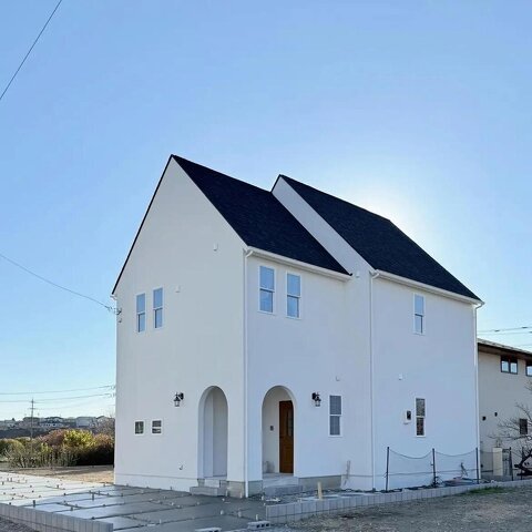 今回ご見学いただけるお住まいは三角屋根と真っ白な塗り壁が目を引く2階建て。
