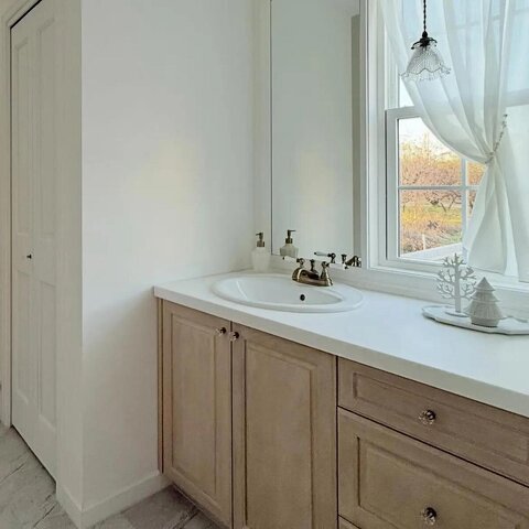 室内では優雅な框扉のデザインが美しい、こちらも同じく真っ白なオーダーキッチンや、まるで映画のワンシーンのような木の温もりあふれるオーダーの洗面台が体感できます。