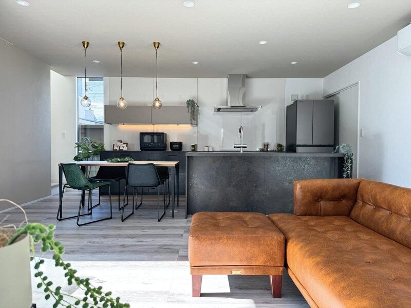 グレーを基調とした、デザイン性の高いモダンなダイニングキッチン。吹き抜けの高窓だけでなく、西側のスリット窓から陽の光が適度に入るため常に明るい。